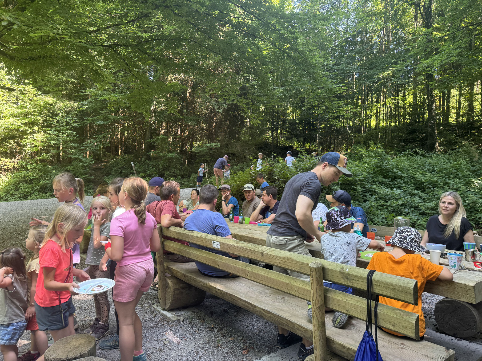 Wir genossen einen geselligen Waldnachmittag bei der Hofjüngerhütte,  bastelten Pfeil und Bogen und balancierten über die Seilbrücke. Der feine Dessert liess die Kinderherzen höher schlagen.