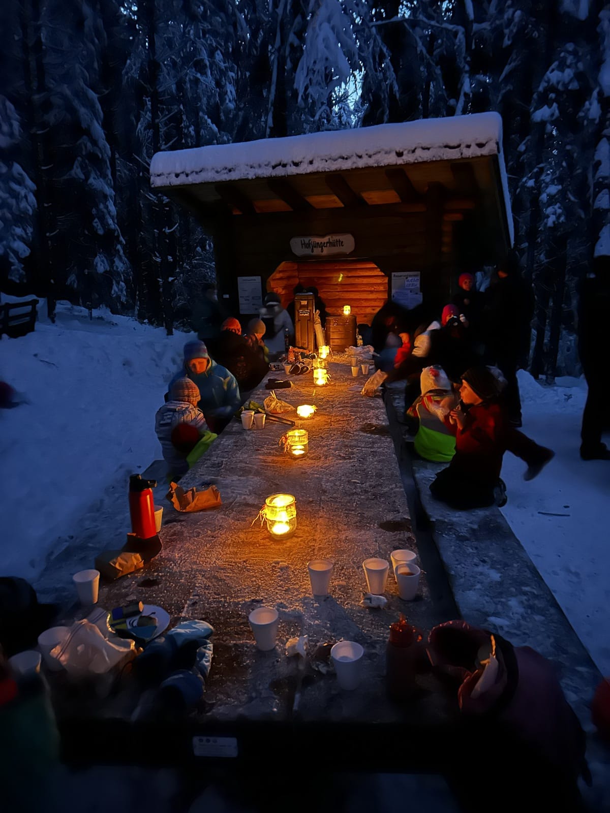 Fast 30 Kinder stapften mit ihren Begleitpersonen durch den tief verschneiten Wald zur Hofjüngerhütte. Mit Punsch, Glühwein und einem wärmendem Feuer wurden sie empfangen.