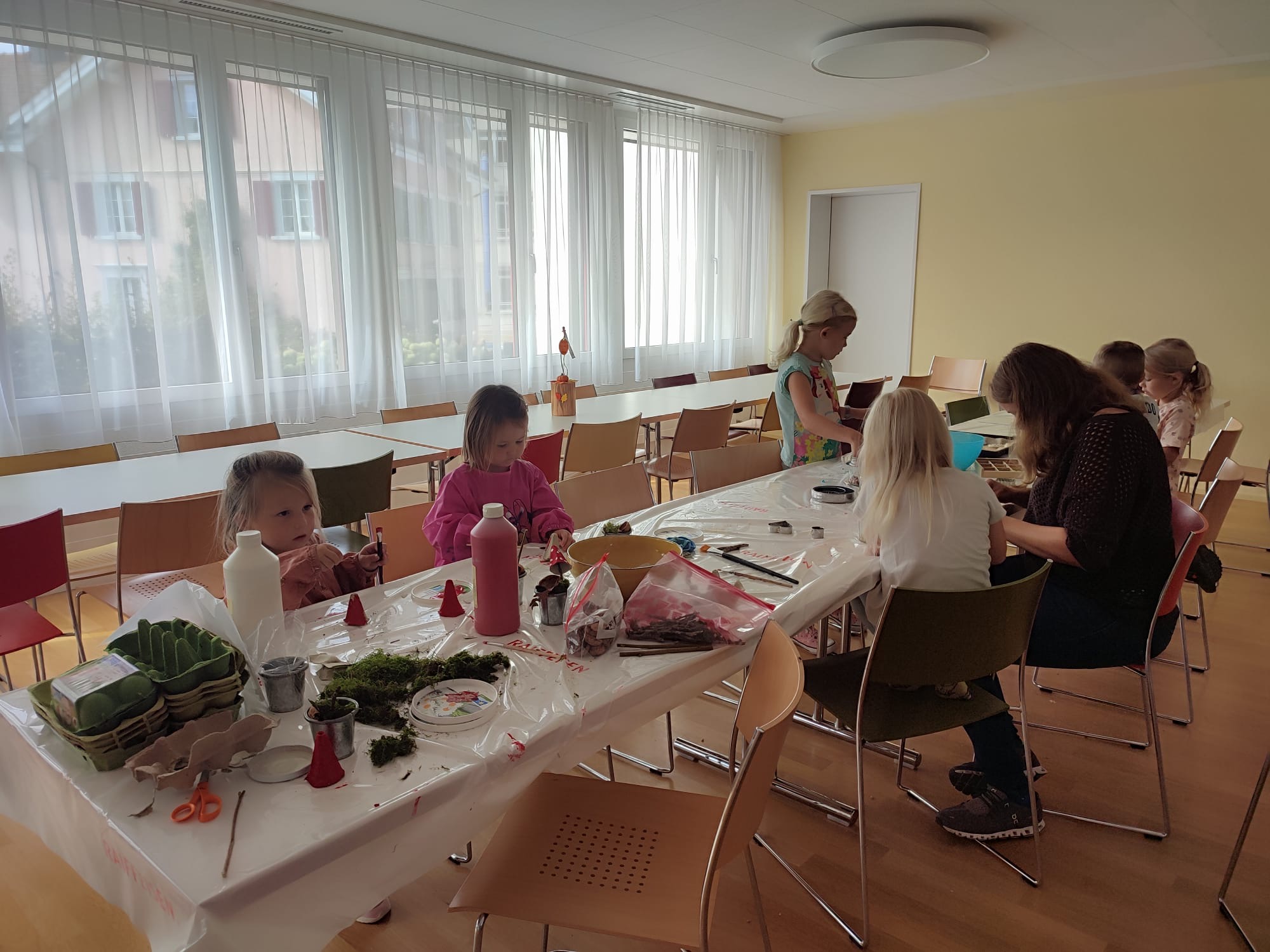 Passend zum Herbstanfang konnten sich die Kinder kreativ austoben. Fleissig wurden Salzteigkreationen, Windlichter, Fliegenpilze und Igel gebastelt.
